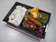 商品番号 HLB-421 商品名 ハンバーグ・エビフライ弁当 金額 1350円 定番のハンバーグ・デミグラスソースと、大きなエビフライのセットです。
